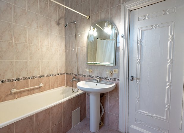 Санузел: ванна, унитаз, раковина, полотенца, гигиенические средства