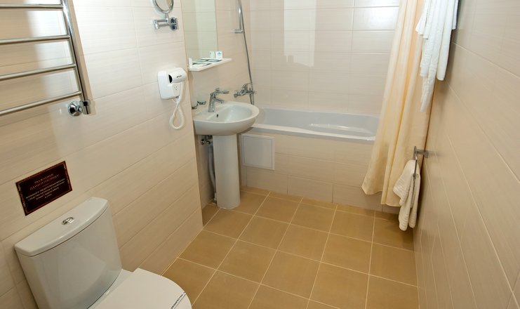 В номере: кровать двуспальная, стол, столик туалетный, стулья, гладильная доска, набор посуды, сейф, сплит-система, телевизор, утюг, холодильник, электрочайник